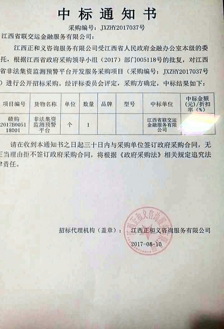2017年8月9日,江西省聯(lián)交運(yùn)金融服務(wù)有限公司(以下簡(jiǎn)稱“公司”)成功中標(biāo)江西省非法集資監(jiān)測(cè)預(yù)警平臺(tái)開(kāi)發(fā)服務(wù)項(xiàng)目,這標(biāo)志著公司在向江西省地方金融統(tǒng)一監(jiān)管云平臺(tái)的建設(shè)目標(biāo)上又邁出了堅(jiān)實(shí)一步。