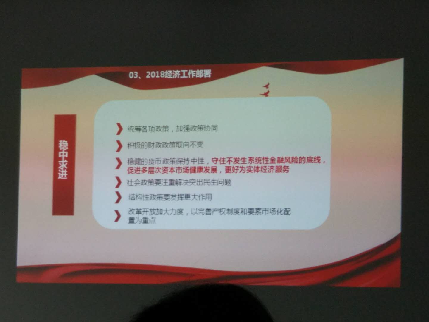 本次會(huì)議認(rèn)真深入學(xué)習(xí)了中央經(jīng)濟(jì)工作會(huì)議精神,就中央經(jīng)濟(jì)工作回憶中提出的堅(jiān)持“穩(wěn)中求進(jìn)”工作總基調(diào),服務(wù)于供給側(cè)結(jié)構(gòu)性改革這條主線,要全面把握以新發(fā)展理念為主要內(nèi)容的習(xí)近平新時(shí)代中國(guó)特色社會(huì)主義經(jīng)濟(jì)思想內(nèi)涵,了解我國(guó)經(jīng)濟(jì)基本特征由高速增長(zhǎng)階段轉(zhuǎn)向高質(zhì)量發(fā)展階段的變化等內(nèi)容進(jìn)行了認(rèn)真學(xué)習(xí)。