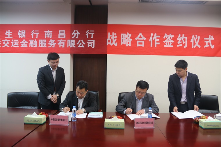 2016年4月11日,江西省聯(lián)交運金融服務(wù)有限公司(以下簡稱“江西聯(lián)交運”)與中國民生銀行南昌分行(以下簡稱“民生銀行南昌分行”)舉行戰(zhàn)略合作協(xié)議簽約儀式,正式建立全面戰(zhàn)略合作伙伴關(guān)系。出席本次簽約儀式的有:民生銀行南昌分行行長朱東勇、副行長崔俊峰、公司銀行部總經(jīng)理曾友紅、新建支行行長王海、江西聯(lián)交運常務(wù)副總經(jīng)理劉祖國、業(yè)務(wù)發(fā)展部經(jīng)理徐文龍、徐顯焱等。