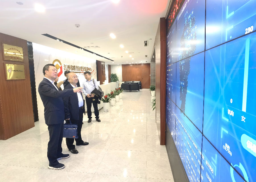 童詠雷一行首先觀摩了公司輔助監(jiān)管信息展示大屏,詳細(xì)了解了公司輔助地方金融監(jiān)管部門建設(shè)運(yùn)營的“贛金鷹眼”、“贛金衛(wèi)士”等信息化監(jiān)管平臺的管理運(yùn)行情況和創(chuàng)新做法,并給與高度肯定。