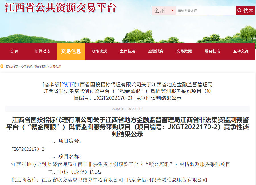 繼連續(xù)兩年中標(biāo)江西省非法集資監(jiān)測預(yù)警平臺(“贛金鷹眼”)運維服務(wù)項目后,近日,江西聯(lián)交運又中標(biāo)江西省非法集資監(jiān)測預(yù)警平臺(“贛金鷹眼”)輿情監(jiān)測服務(wù)項目。