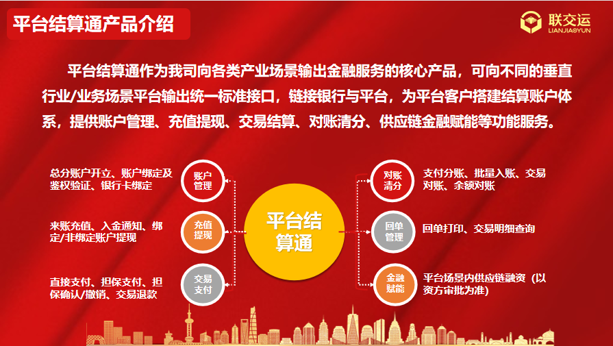 平臺結(jié)算通是公司沉心運營8年多來,不斷優(yōu)化升級集中登記結(jié)算管理服務(wù)的各項功能體驗和各類場景服務(wù)輸出,重點建設(shè)打造的為地方交易場所及多類型垂直行業(yè)/業(yè)務(wù)場景提供全鏈路交易資金“收+管+付”的綜合服務(wù)解決方案。平臺結(jié)算通可滿足地方交易場所及各類B2B、B2C交易平臺的資金存管、實時結(jié)算、賬戶管理等共性需求,包括但不限于提供總分賬簿開立、多渠道充值提現(xiàn)、擔(dān)保交易支付、批量對賬清分、回單打印查詢、供應(yīng)鏈金融賦能等一體化資金結(jié)算和賬戶管理服務(wù)。