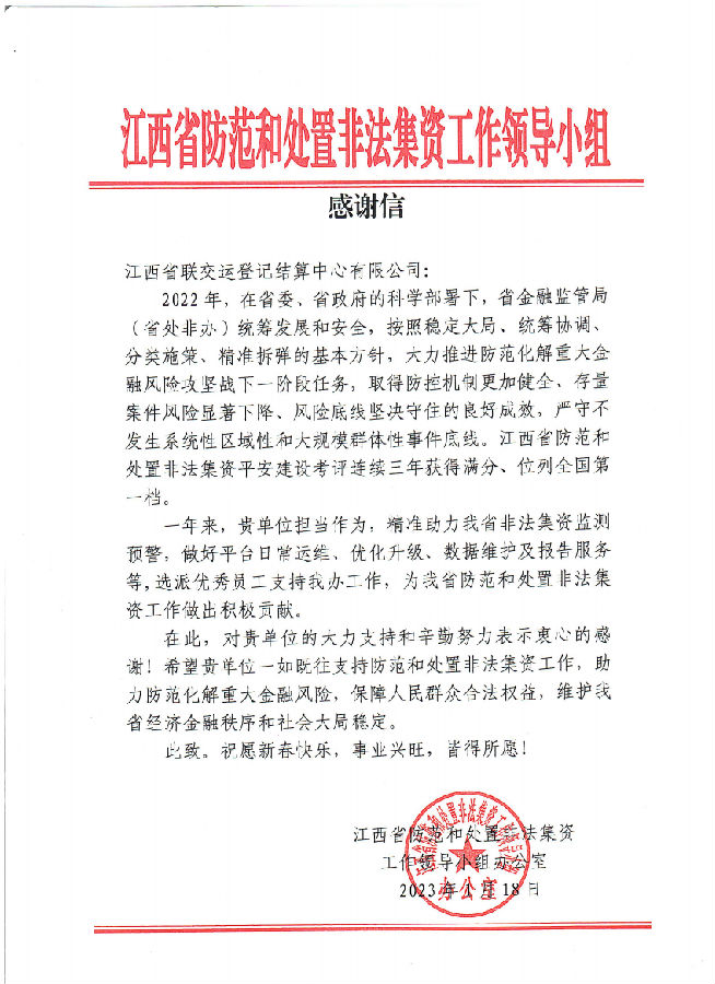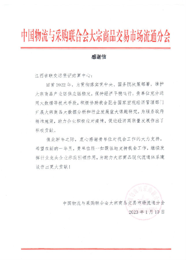 新春佳節(jié)來臨之際,江西聯(lián)交運連續(xù)收獲兩封來自江西省防范和處置非法集資工作領(lǐng)導(dǎo)小組辦公室和中國物流與采購聯(lián)合會大宗商品交易市場流通分會的《感謝信》,分別對公司長期以來助力我省防范和處置非法集資工作,保障地方金融穩(wěn)定以及協(xié)助維護(hù)大宗商品產(chǎn)業(yè)鏈供應(yīng)鏈穩(wěn)定,促進(jìn)實體經(jīng)濟(jì)高質(zhì)量發(fā)展等方面作出的積極貢獻(xiàn)表達(dá)肯定和真誠感謝。